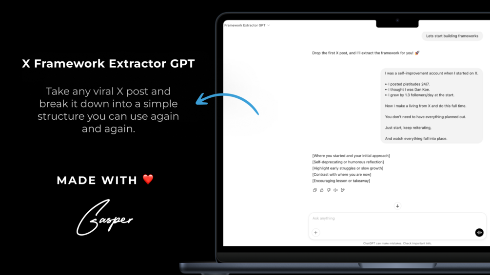 With X-Framework GPT, you can take any viral X post and break it down into a simple structure you can use again and again.