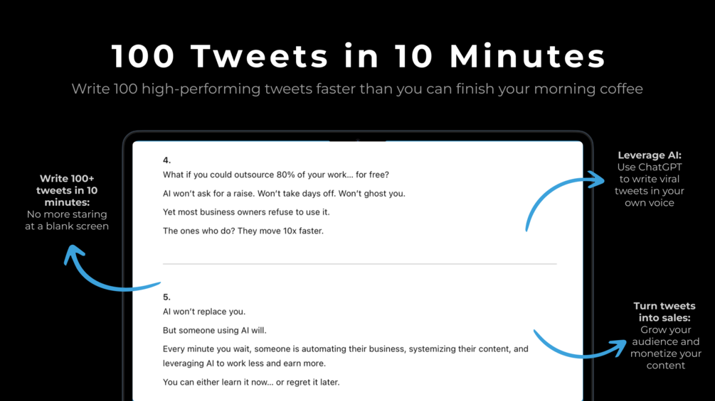 - The 100 Tweets in 10 Minutes Operating System – Learn how to pump out high-quality tweets in minutes using ONE power ChatGPT prompt.