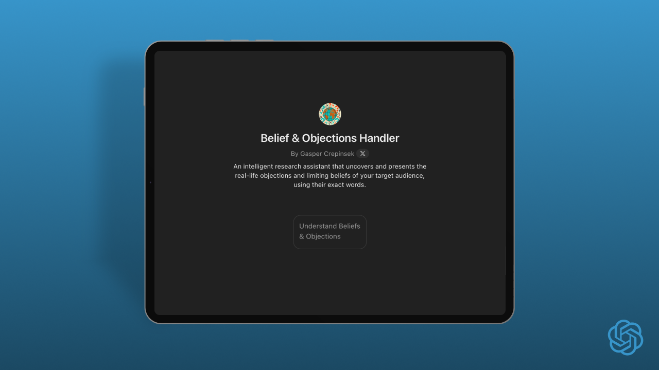 - How does it work? Belief & Objection Handler GPT searches the web for real objections and beliefs of your target market and summarizes them in a clear, actionable report.