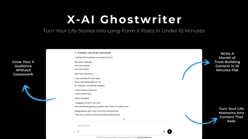 You’re getting my complete X-AI Ghostwriter System. 3 custom-built GPTs that help you turn raw thoughts and real-life moments into powerful, trust-building Twitter content in under 10 minutes.